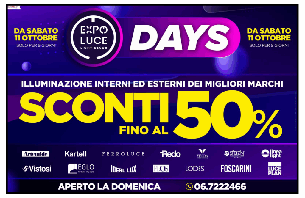 Approfitta degli EXPO LUCE DAYS, scarica l’invito e corri in Showroom. Sconti Fino al 50% SOLO per 9 giorni.
